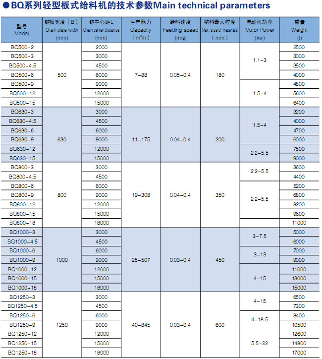 輕型板式給料機用來處理100mm-200mm塊狀物料,廣泛用於有色、礦山、水泥、化肥、化工、冶金造紙等行業的采選、輕運、配料等工藝過程中,適用於沿水平或傾斜段向工作機械或料倉、漏鬥等其他容器連續均勻地輸送物料。物料容重不大於1.2t/m3,塊重不超過140kg,溫度不高於350℃的散狀物料。WBL 中型板式給料機(簡稱板喂機)是一種散狀物料輸送設備,把間歇式給料轉變為連續性給料。本公司在引進國外先進技術上全新開發的 WBL 型板喂機,具有牽引力大,漏料少,運行平穩,使用壽命長,檢修方便的優點。