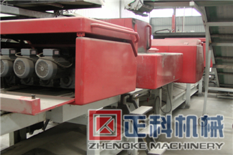 CYQB-Ⅰ型工業灰渣混凝土空心隔牆條板自動化生產線設計能力為年產50萬㎡牆板,設備主機固定,牆板成型時物料受擠壓和振動同時作用,邊模、芯模連續擠壓振搗成型、連續自動脫模,保障牆板具有良好的密實性和外形尺寸,成型後采用鋼托板托護穩定進行初凝養護。板坯移動方便,場地使用靈活、利用效率高。傳動裝置帶動托板移動流轉,成型工段推料擠壓螺旋變頻調速,由中央控製器調整控製灰渣板成型的密實程度,實現灰渣板的連續自動流水線生產。由於采用低水灰比的幹硬性混合料擠壓成型,可得到強度和密實度較高的空心牆板。水灰比0.3~0.4,坍落度為0,幹縮率<0.03%,避免產生目前國內輕質隔牆板生產應用中普遍存在的收縮裂縫問題。自動化連續生產,效率高、質量一致性高、保障了牆板品質。